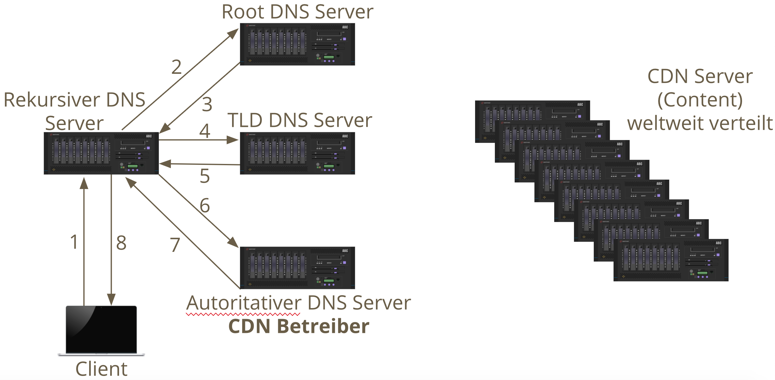 Die Grundlage vieler CDNs ist dabei DNS. Um zu verstehen wie genau DNS dabei genutzt wird, schauen wir uns die Abbildung unten an. Ein CDN-Kunde tritt zunächst die autoritative DNS-Auflösung an den CDN-Provider für die zu hostenden Namen ab, d.h. der autoritative DNS-Server wird nun vom CDN-Provider gestellt. Im Bild links sieht man den iterativen DNS-Auflösungsprozess, wie wir ihn bisher kennengelernt haben. Der Host sendet seine Anfrage and den rekursiven DNS-Server, der die gesamte Anfrage abwickelt und dem Host letztendlich die Antwort sendet. Der autoritative DNS-Server am Ende der iterativen Auflösung ist nun in CDN-Provider Hand, und dieser muss nun mit der IP-Adresse des für den Kunden besten (meist der topologisch nähste) Servers des CDN-Providers antworten. Diese Information ,also was der zum Host topologisch nächste Server ist, ermittelt der autoritative DNS-Server aus der IP-Adresse der Anfrage. Hier stellt sich aber ein Problem, denn der CDN-DNS-Server hat niemals mit dem Host direkt Kontakt, sondern nur mit dem von ihm genutzten rekursiven DNS Server. D.h. der DNS-Server kennt nur die IP-Adresse des rekursiven DNS-Servers und nicht die des Clients. Anders ausgedrückt, der autoritative DNS-Server kann nur einen CDN-Server für die Antwort auswählen, der nah beim rekursiven Server ist. Da der rekursive Server und der Host in der Regel topologisch sehr nah beieinander sind, ist dies in der Praxis tatsächlich kein Problem.